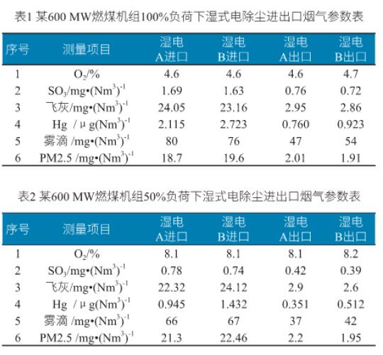 針對某600MW燃煤機組工程化應(yīng)用在100%負(fù)荷及50%負(fù)荷條件下進行了測試,測試結(jié)果詳見表1和表2,出口煙塵濃度均滿足設(shè)計值,也大大低于超低排放標(biāo)準(zhǔn),同時濕電對三氧化硫、汞及霧滴的協(xié)同脫除作用也非常明顯。