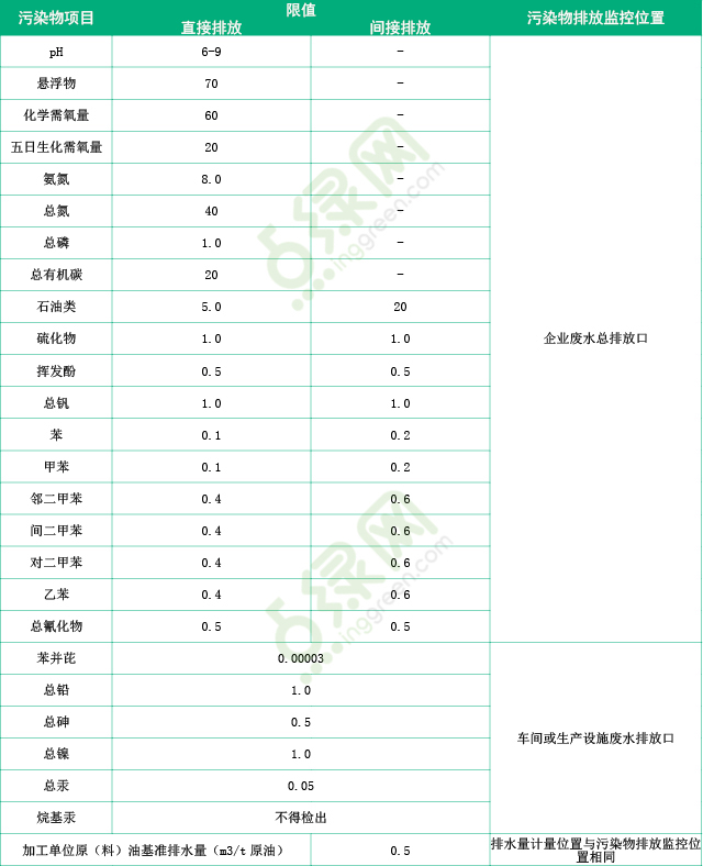 2015年7月1日開始實(shí)施的GB31570–2015《石油煉制工業(yè)污染物排放標(biāo)準(zhǔn)》和GB 31571-2015《石油化學(xué)工業(yè)污染物排放標(biāo)準(zhǔn)》,規(guī)定了石油煉制工業(yè)企業(yè)和石油化學(xué)工業(yè)企業(yè)及其生產(chǎn)設(shè)施的水污染物和大氣污染物排放限值、監(jiān)測(cè)和監(jiān)督管理要求。其中新建企業(yè)石油煉制工業(yè)企業(yè)水污染物排放標(biāo)準(zhǔn)如表2:
